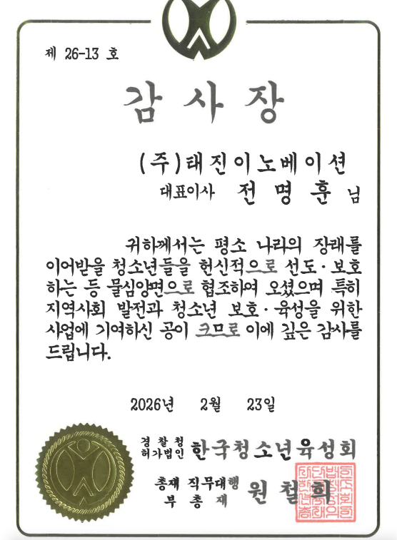 (주)태진이노베이션은 앞으로도 기업의 사회적 책임을 다하며, 지역사회와 미래 세대의 밝은 내일을 위해 꾸준히 나아가겠습니다.